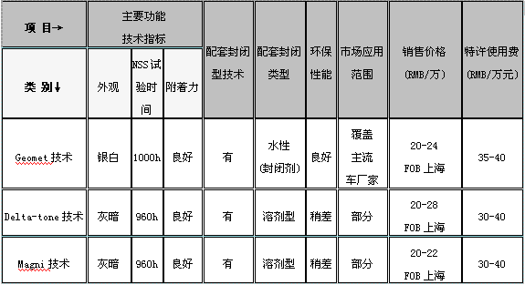 近年來,該涂料技術(shù)尤其在汽車行業(yè)得到迅速的認證和推廣應(yīng)用,許多國際知名汽車公司如福特(Ford)、通用、寶馬(Bwm)、雷諾、菲亞特(Fiat)、沃爾沃(Volvo)、戴姆勒?克萊斯勒等都制定了零配件Geomet涂裝標準(見附錄),要求必須使用Geomet涂料涂裝技術(shù)。 國外同類技術(shù)的發(fā)展概況: