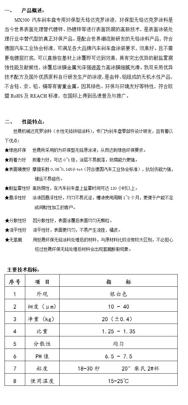 產(chǎn)品名稱:MX500汽車剎車盤專用環(huán)保型無(wú)鉻達(dá)克羅涂液