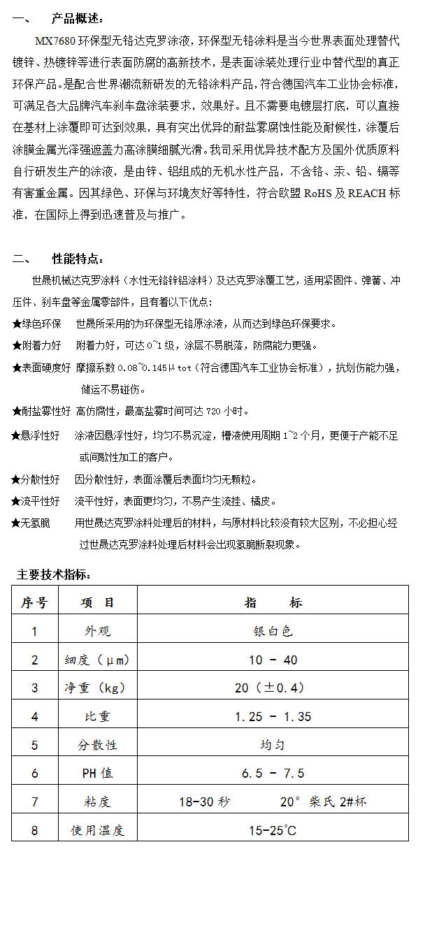 產(chǎn)品名稱:MX7680環(huán)保型無鉻達(dá)克羅涂液